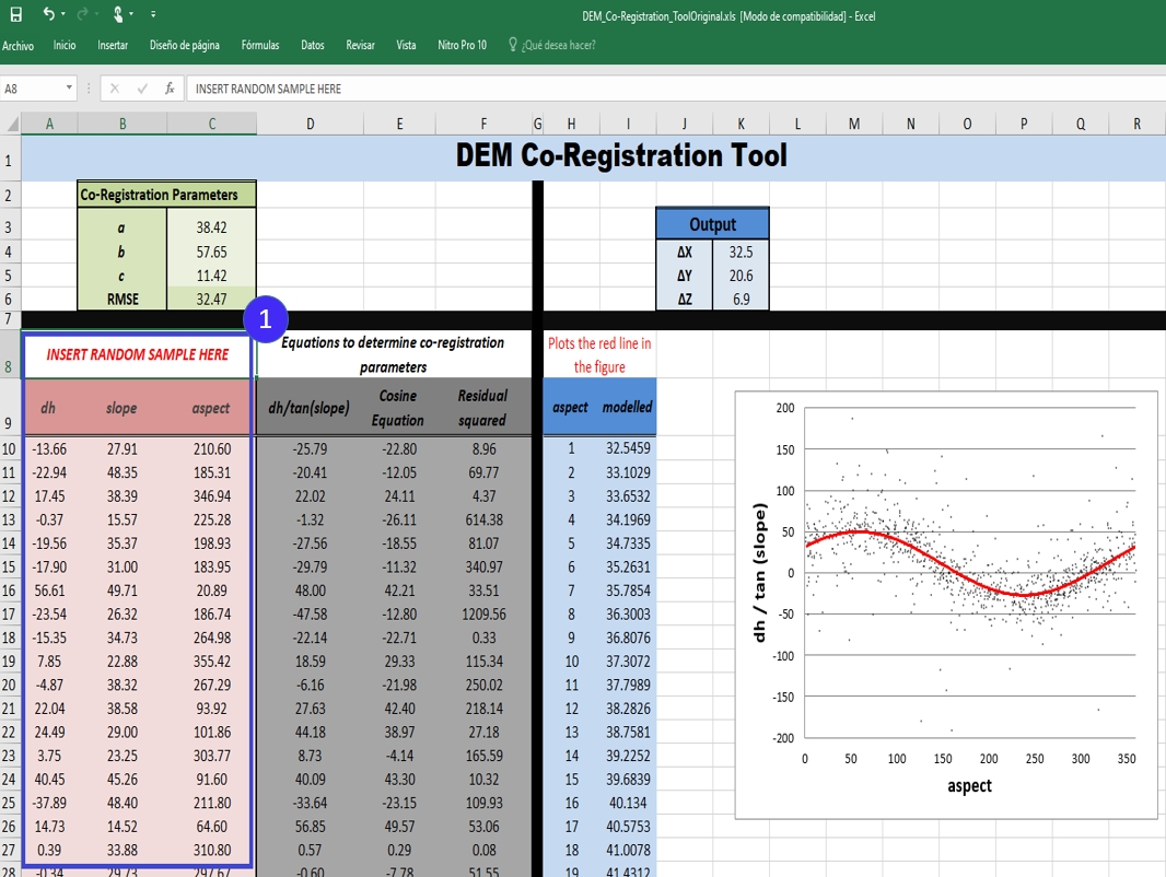 DEM Co-Registration Excel Toolprovided by Nuth and Kaab (2011). Can be downloaded here:Thirdly, open the random point sample excel file. Remember, for each record an elevation difference, and its corresponding slope and aspect values are mandatory. Copy the corresponding values and paste them in the columns A, B and C