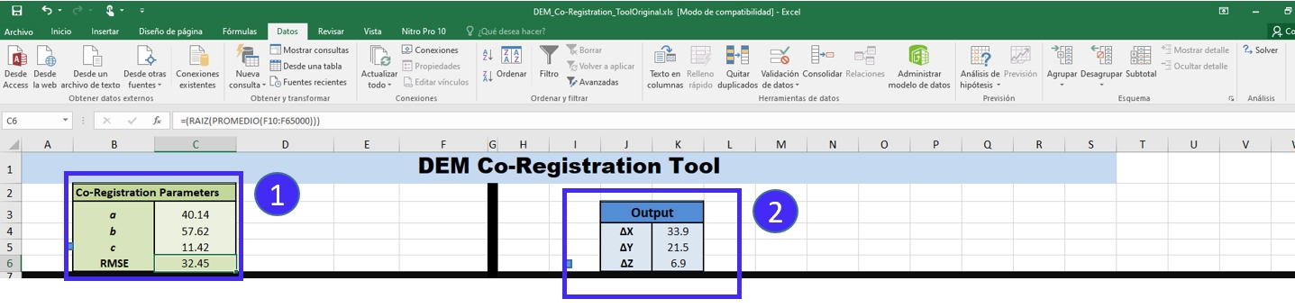 Fig. 5.11 DEM Co-Registration Excel Tool. The blue box shows the columns where the data input should be inserted.¶