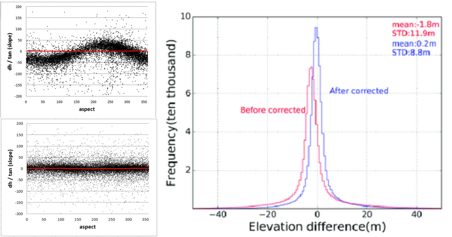 Fig. 5.15 Comparison of the elevation difference by the tangent of the slope, before and after coregistration, and the fitted cosine curve (red line). Example of the resulting histograms of the residuals after adjustment for bias.¶