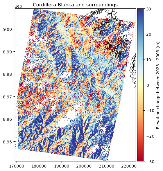 Fig. 5.1 Difference of DEMs (DoD) generated from ASTER images using ASP between 2003 and 2023. Visualized in QGIS.¶