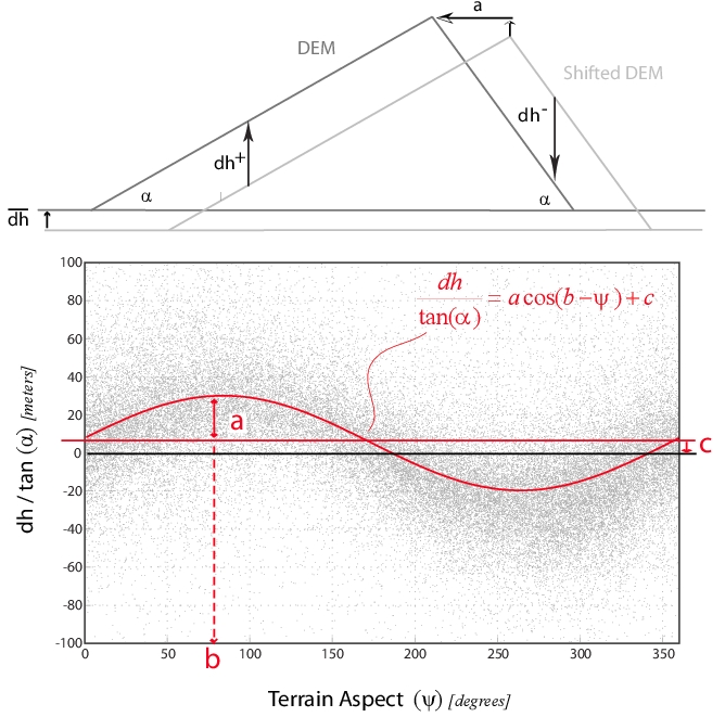 To ensure a precise xyz alignment between the DEMs, an iterative method called co-registration proposed by [24] is commonly applied. This method is based on the elevation differences of the two misaligned DEMs, and it assumes that the surface elevation change is a function of the slope and the aspect of the terrain :numref:``.