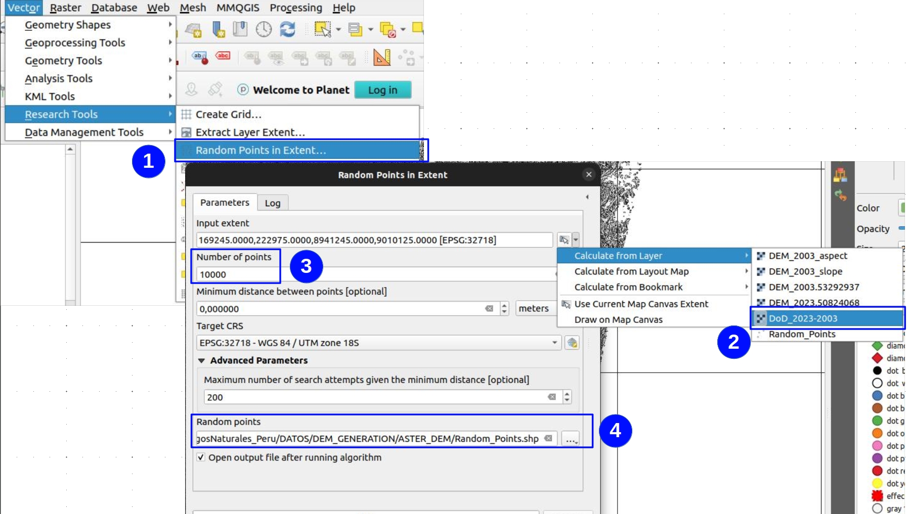 Once those results are generated, you will have to generate point samples from where coregistration will be calculated. To do so, you have to go to Vector -> Research Tools -> Random points in Extent. By using this tool Fig. 5.5, you will randomly generate 10 000 points shapefile based on the same extent of the Difference of DEM’s. The results of this procedure should look like in Fig. 5.6.