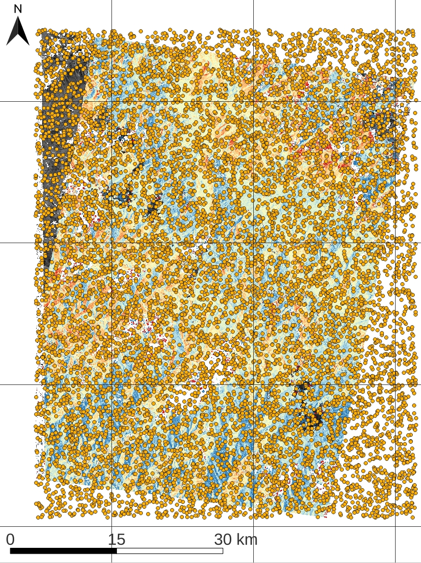 By clicking on Select features, QGIS will select all features who meet the conditions for the three columns. The selection returns ~ 3830 points features. Since the point features were generated randomly, the selected points may differ for you. Finally, once you have selected the points, the final step is to delete them. To do so, you will Edit the points features and click on Delete selected. By doing so, we have reduced the initial point sample from 10 000 to 6 100 points. The results must look like Fig. 5.8.