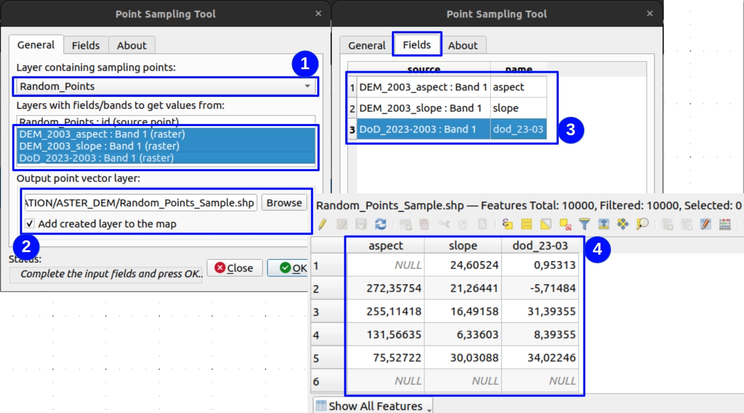Once the points are generated, you will have to extract the values of the DoD 2023-2003, slope and aspect rasters to the points. To do so, you will use the Point Sampling Tools plugin in QGIS. If you don’t have this plugin installed, please refer to the section Plugin -> Manage and Install Plugins, and type Point Sampling Tool. This plugin takes one point vector shapefile and several raster files to extract the value of the overlaid pixel, from the selected rasters. More information on the official webpage. You have to select the Random_points.shp file as well the raster files Fig. 5.7. Once the layers are selected, you can rename the columns to keep the column names clear and short Fig. 5.7. As a result, you will obtain a new shapefile that you will rename as Random_points_sample.shp but this time, you will find in the attribute table the columns you modified previously containing the pixel values from raster files Fig. 5.7.
