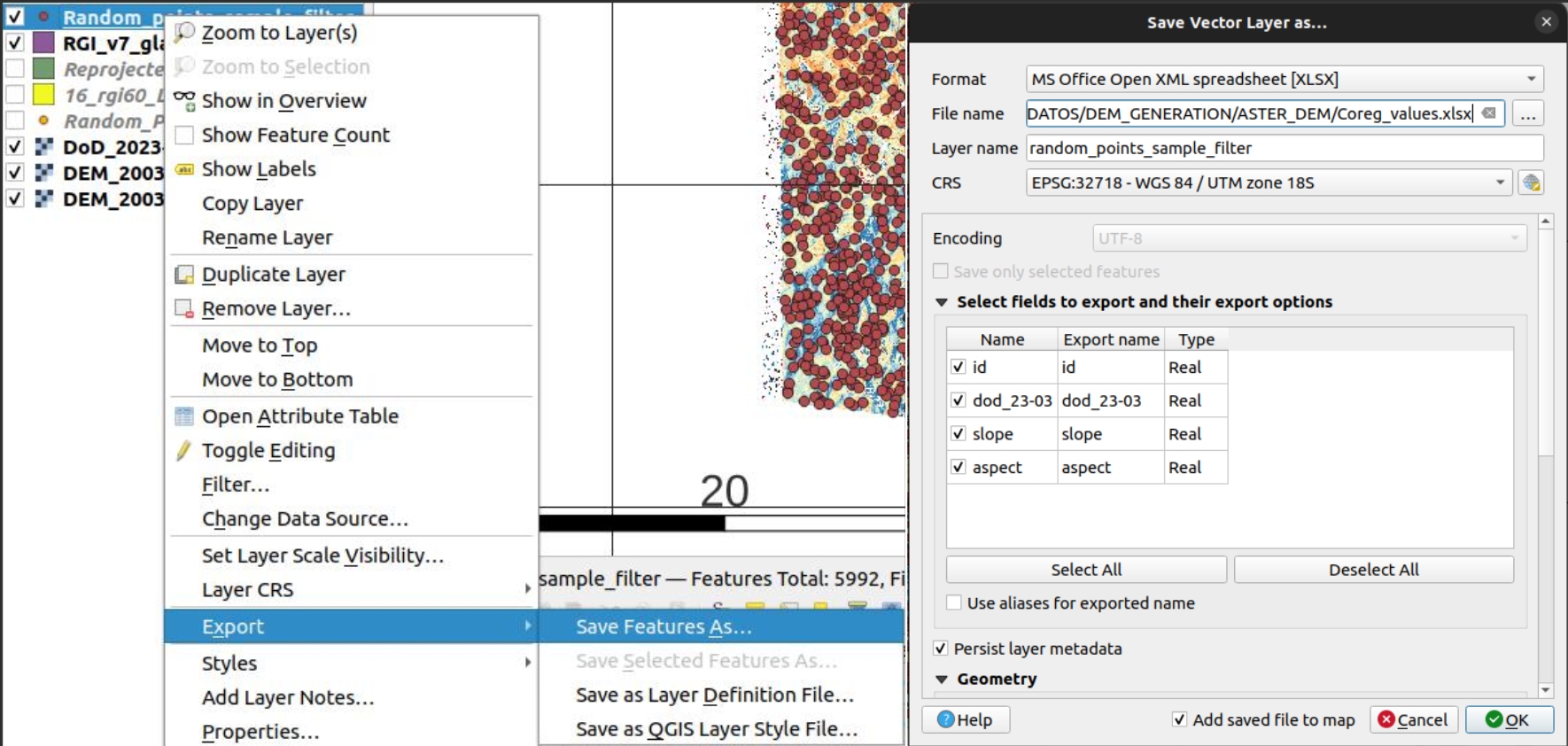 As a final step, you will export the attribute table of the remaining points. To do so, you will make right click on the layer Random_points_sample.shp and you will click on Save Features As…. Within the save vector layer menu you will change the format as MS Office Open XML spreadsheet [XLSX], which is the format excel. Finally, select the desired directory and click on OK; This procedure will export the entire attribute table in format excel.