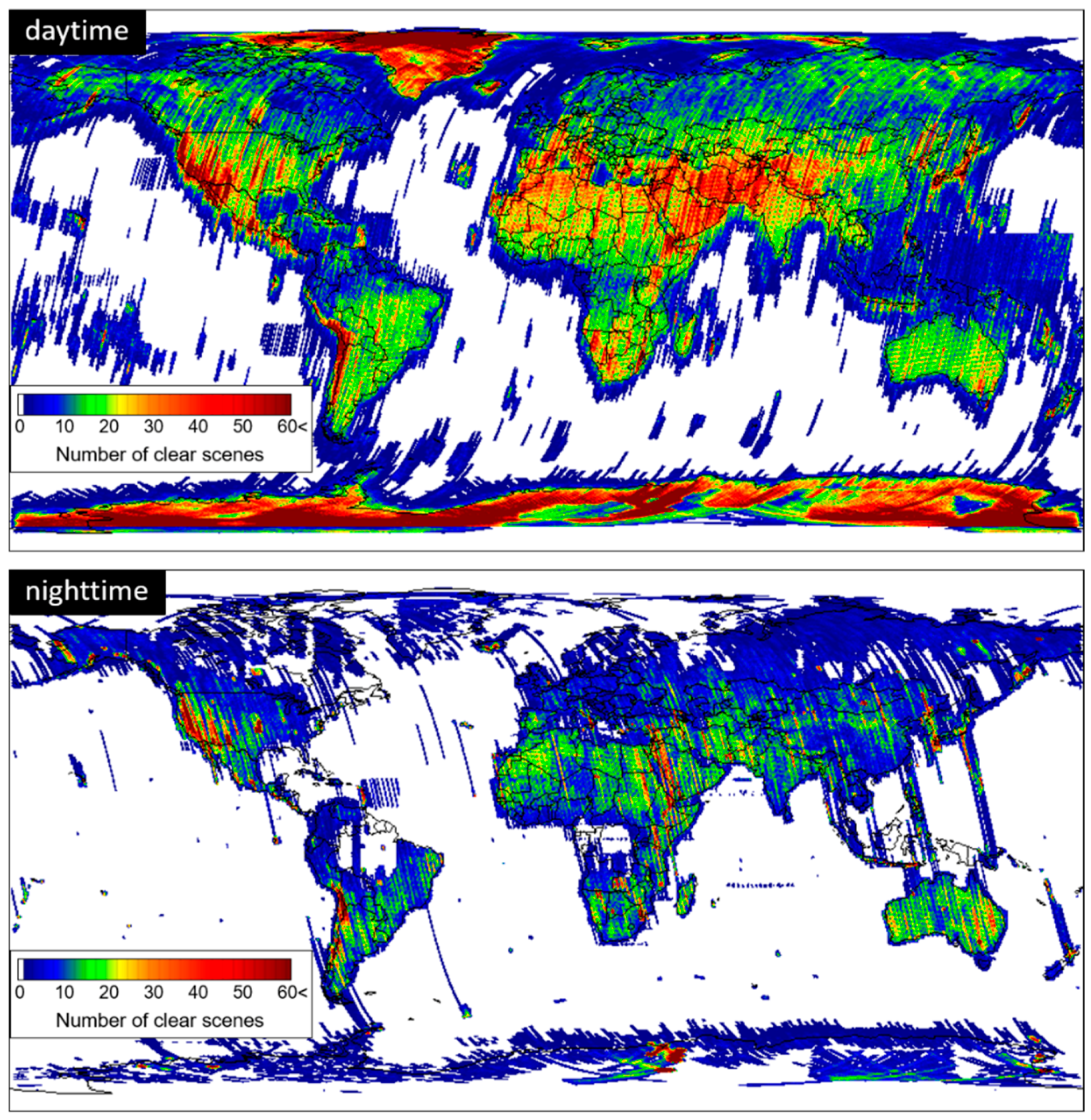 Fig. 4.1 Daytime and nighttime maps of the number of clear scenes with a CC of 20% or less over 10 × 10 degree grids in 19.5 years from March 2000 to August 2019 [20].¶