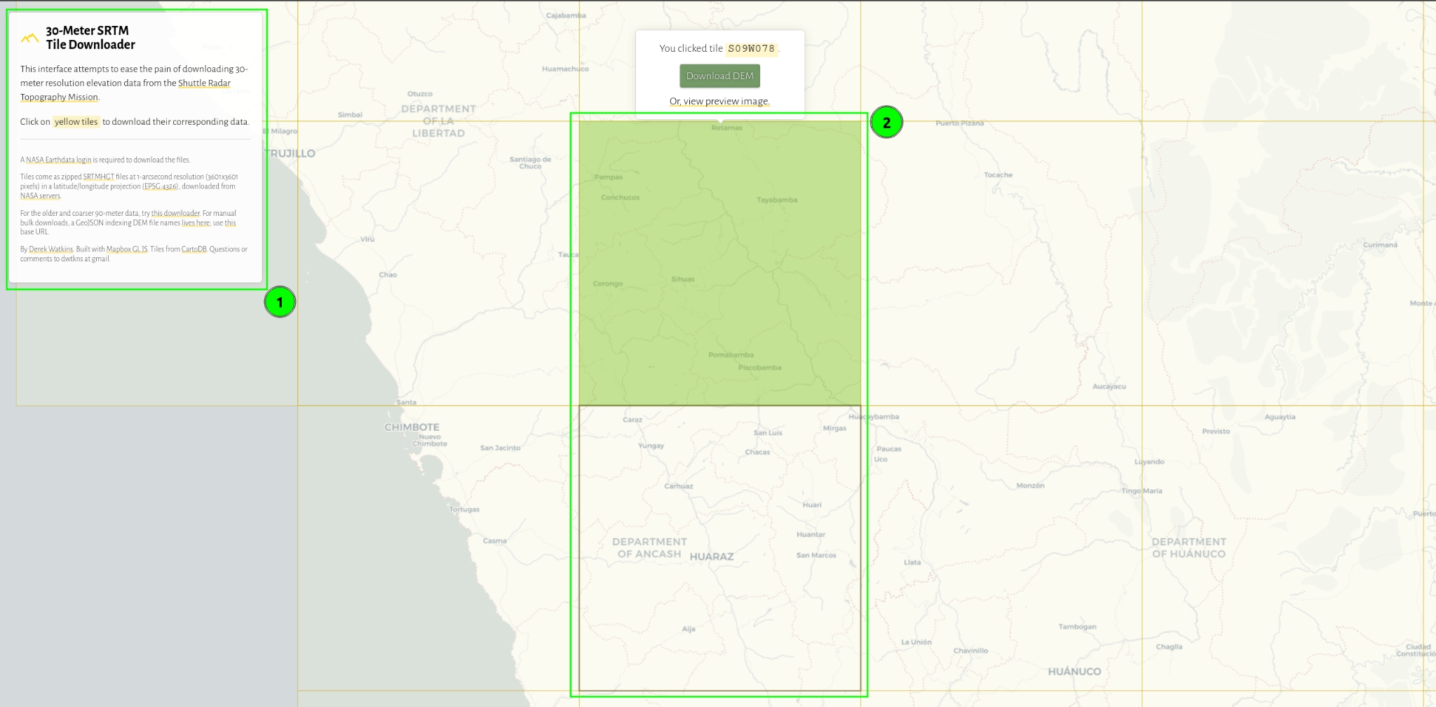 As the activation of EarthData can take a long time, we already provide SRTM tiles. for this excersice we will use two tiles with codes ‘S09W078’ and ‘S10W078’ Fig. 4.3. You can find the data in the directory DATA/DEM_GENERATION/SRTM_DEM.