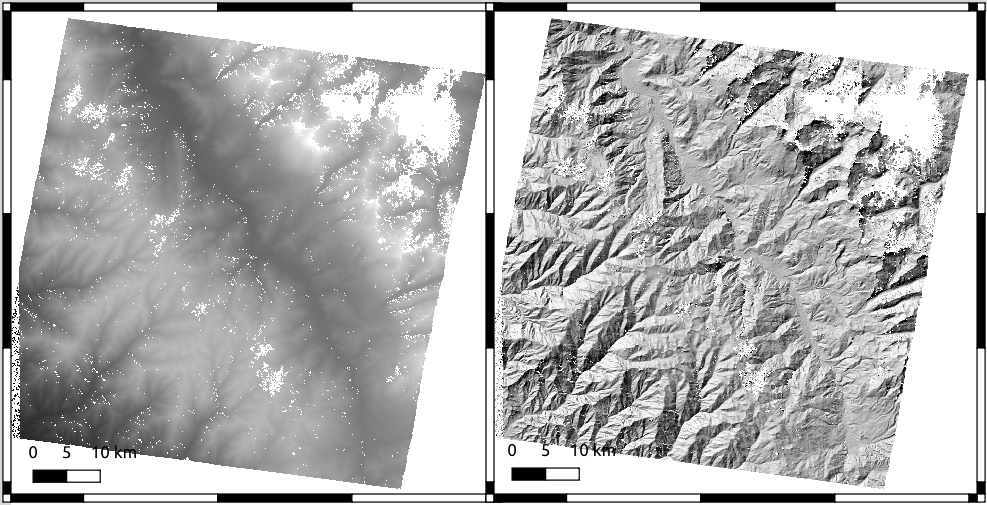 Fig. 4.5 DEM generated from ASTER images using ASP. Left: DEM visualisation; Right: DEM using hillshade effect; visualized in QGIS.¶